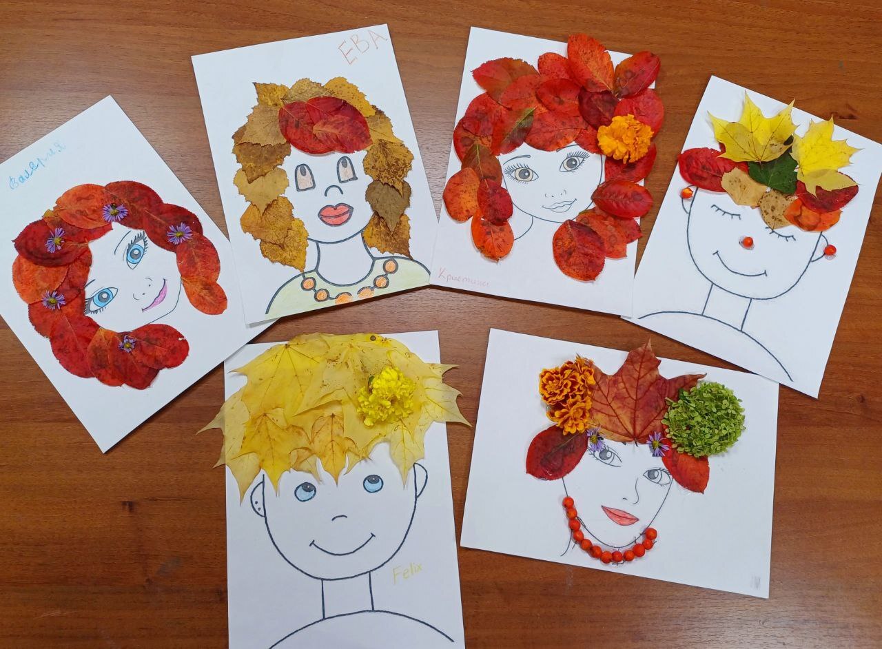 На занятии дети познакомились с профессией парикмахер и представив себя в этой роли, выполнили аппликации из сухих осенних листьев в виде креативных причёсок.