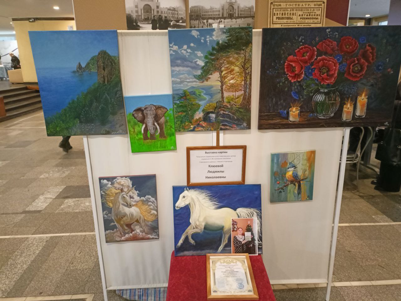 Мы гордимся тем, что среди представленных работ была выставка картин талантливой получательницы социальных услуг — Клюевой Людмилы Николаевны.